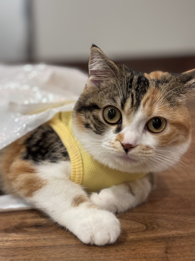 猫によっては服を嫌がる子もいますが、ミケちゃんは思ったより落ち着いて着てくれて、